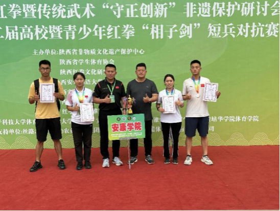 第二届高校暨青少年红拳“相子剑”短兵对抗赛在长安校区文体馆举行。本次比赛由陕西省非物质文化遗产保护中心、陕西省学生体育协会、陕西红拳文化研究会和西安外国语大学共同主办。作为陕西省迄今为止规模最大的武术短兵赛事,本次比赛吸引了来自陕西各高校、红拳传习所和红拳青少年培训基地的7至56岁,共148名队员参赛。经过激烈角逐,我校武术队侯艾君获得女子60kg级金牌,陈明帅和王正婷两位同学分别获得获男子75kg级银牌和女子55kg银牌,赵好学获得男子65Kg级第五名。