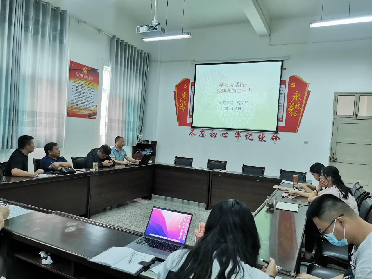 9月14日下午,正规滚球app平台官网党总支书记高立平以“学习讲话精神,喜迎党的二十大”为题,为滚球官网全体党员上专题党课。全体党员参加会议。