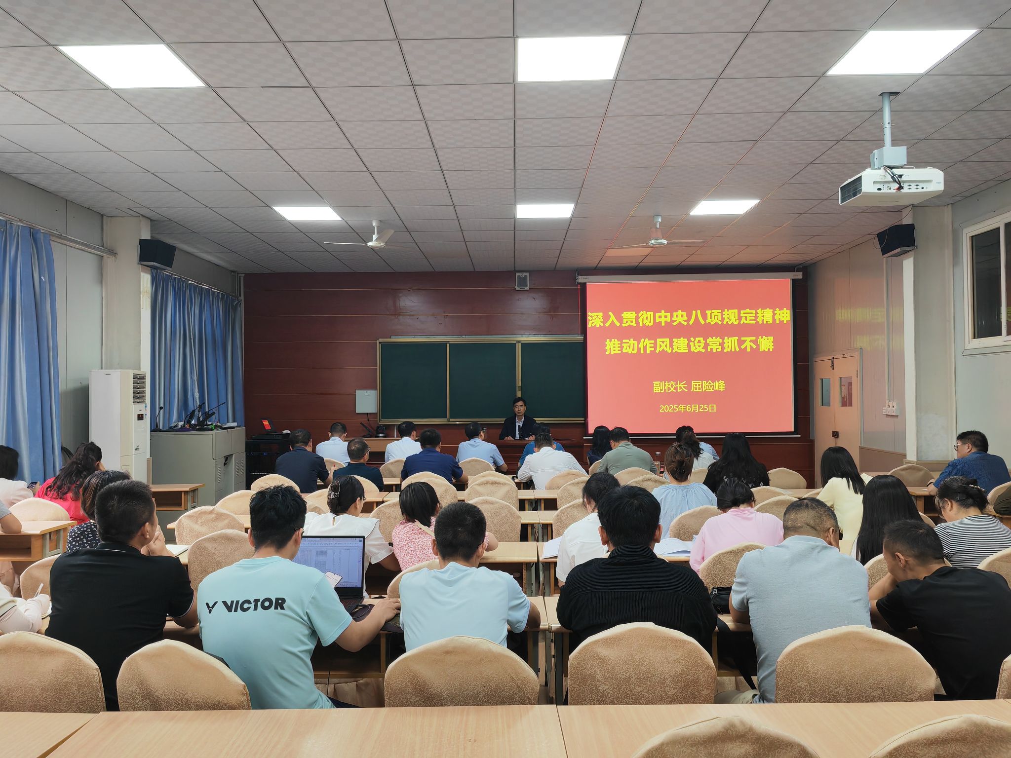 为持续巩固拓展主题教育成果,深入推进全面从严治党,切实强化党员干部作风建设,6月25日下午,副校长屈险峰以《深入贯彻中央八项规定精神,推动作风建设常抓不懈》为题,为正规滚球app平台官网、数统学院、学工部、保卫部、工会、团委、后勤处和信管中心全体党员干部讲授专题党课。