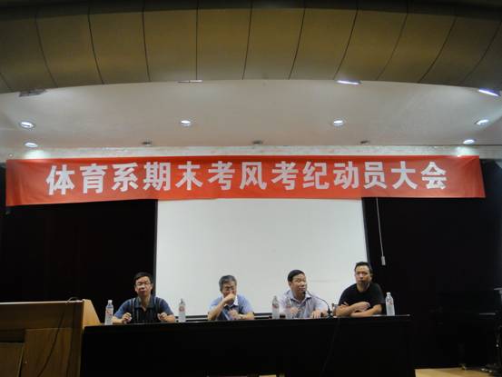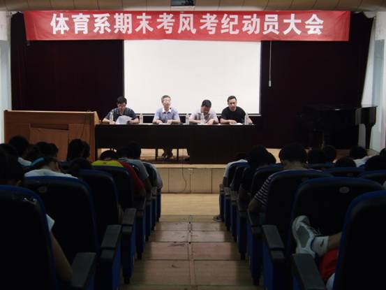 期末考试临近,为端正考风、严肃考纪及督促广大同学认真复习备考,营造公平、公正、诚实守信的考试环境,强化学生的诚信意识,促进学生树立诚信考试的风气,2013年7月3号下午2点30分,体育系在江南校区1号教学楼6楼报告厅召开了考前动员大会。