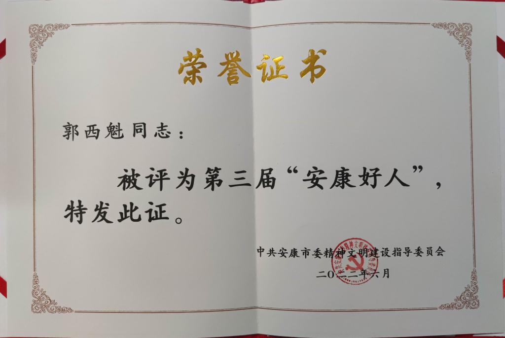 5月31日,中共安康市委精神文明建设指导委员会,授予全市62名(组)同志第五届安康市道德模范称号,授予77名同志第三届“安康好人”称号。滚球官网副院长郭西魁同志被授予第三届“安康好人”称号。希望大家向安康市道德模范称号和“安康好人”称号获得者学习,积极参与安康市的精神文明建设,以优异业绩,向党的二十大献礼。