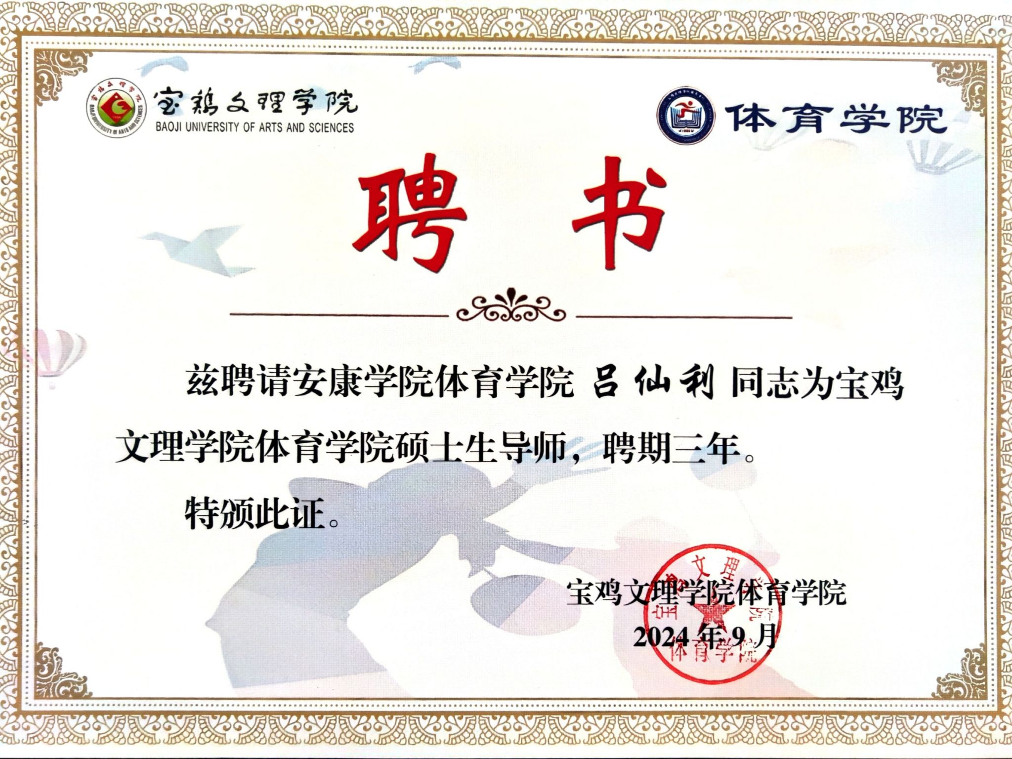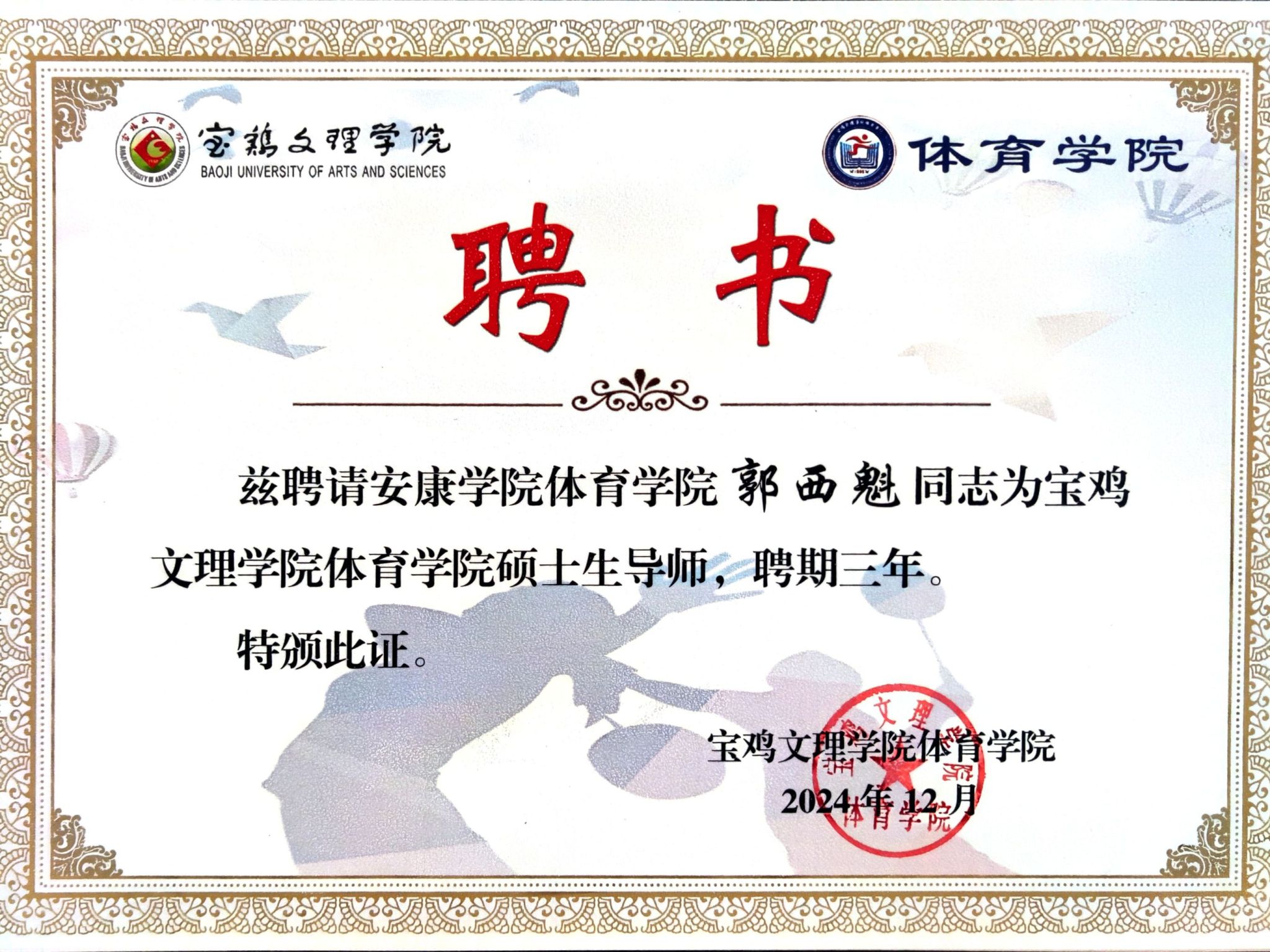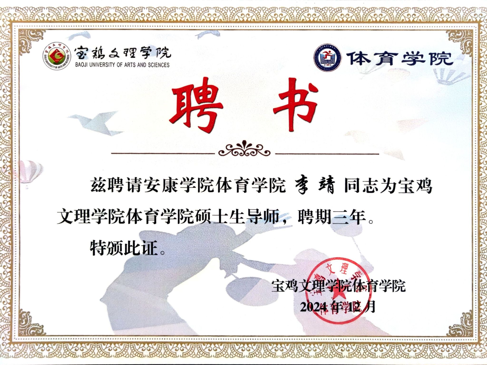 宝鸡文理学院正规滚球app平台官网严格按照专业硕士学位教育的要求,经过层层遴选,决定聘任滚球官网吕仙利、郭西魁、李靖三位老师为宝鸡文理学院正规滚球app平台官网硕士专业学位研究生指导教师。本次聘任工作不仅是宝鸡文理学院正规滚球app平台官网对滚球官网教学师资力量的肯定,同时也将为滚球官网培养一批具有硕士研究生培养经验的人才,为进一步促进滚球官网体育教学、科研工作水平的提高和申报专业硕士点奠定了重要基础。