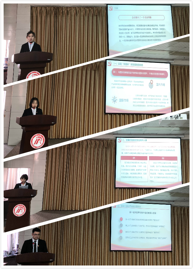 大学生宣讲团四位成员肖翔鸽、韩萌、梁苗苗、杨垚奀同学分别从深刻认识我国进入发展阶段的重大意义、有利条件和重要特征;统筹好发展和安全两件大事;准确把握“十四五”时期我国发展的主导方针、主要目标和2035年远景目标;牢牢把握构建新发展格局的战略构想和重要着力点;坚定不移的贯彻新理念几个方面对党的十九届五中全会精神进行了讲解。