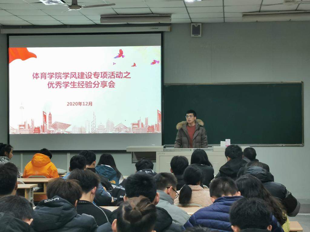 按照《安康学院学风建设月活动方案》相关要求,根据《体育学院学风建设月活动方案》安排,12月29日晚,体育学院在江南校区10号楼1024教室举办了优秀学生经验分享活动。雷欣、张一凡、外语学院张梦娇等三名获得大学生自强之星、国家奖学金、国家励志奖学金的优秀学生代表进行了经验分享。体育学院党总支书记高立平、学工办副主任王立、团总支书记康梦瑶、2019级、2020级共160余名学生了参加活动,活动由王立主持。